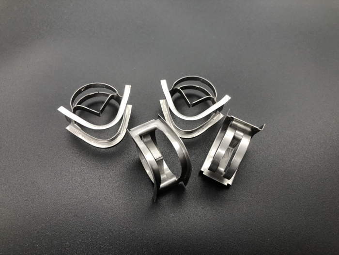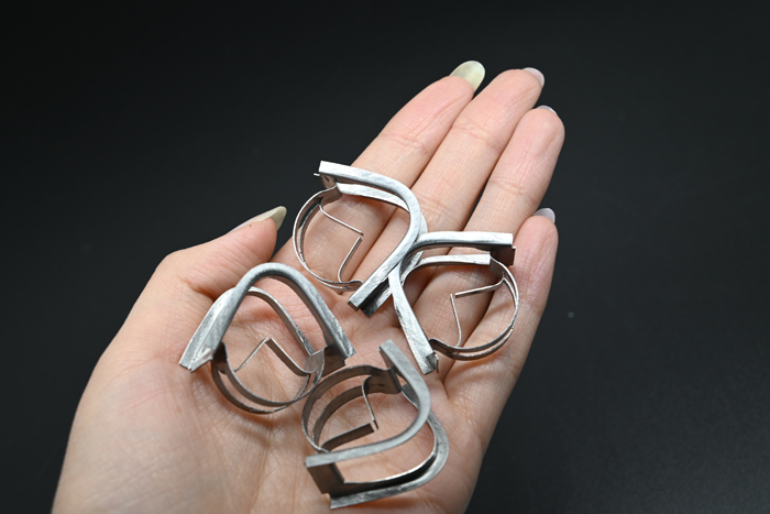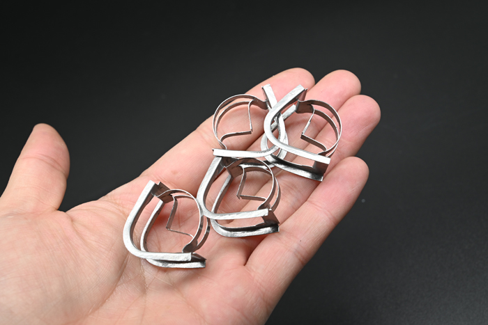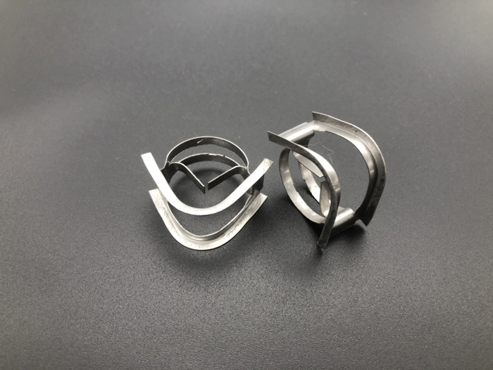環(huán)矩鞍類的填料兼具了開孔環(huán)形填料和鞍形填料的結構特征,金屬矩鞍環(huán)填料在20世紀70年代末制出,其結構可分為兩側,一側是兩邊為矩形的弧形表面,另一側是如環(huán)形填料的圓形結構,環(huán)壁處有數(shù)量不等的開孔,環(huán)內(nèi)有與開孔邊緣相連的內(nèi)伸舌片。金屬環(huán)矩鞍填料這一獨特的結構有效防止填料堆填時發(fā)生重疊,增加單位填料層的比表面積,減小阻力,增大通量,最終達到提高效率的目的。