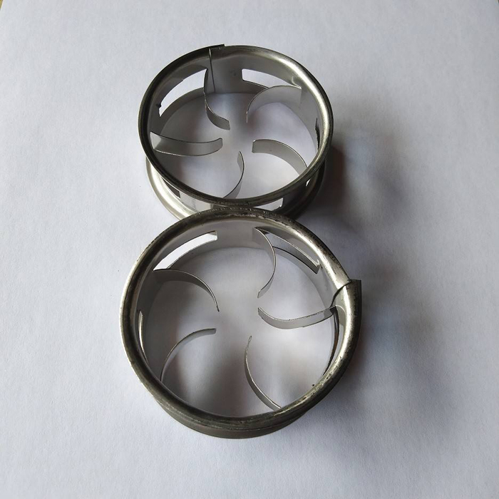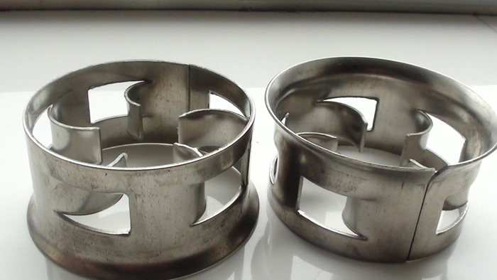 階梯環填料的側端增加了翻邊,不但可以增加填料環的機械強度,而且由于破壞了填料結構的對稱性,因而增加了填料投放時的定向幾率。